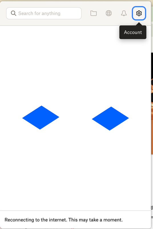 Dropbox simply displays the message: Reconnecting to the internet. This may take a moment. See screen shot.