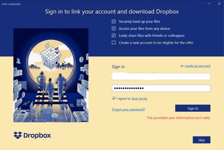 The provided user information isn't valid | Acer Jumpstart