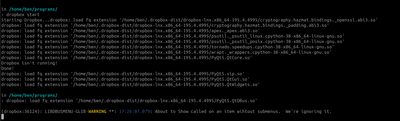 in /home/ben/programs/ › dropbox start Starting Dropbox...dropbox: load fq extension '/home/ben/.dropbox-dist/dropbox-lnx.x86_64-195.4.4995/cryptography.hazmat.bindings._openssl.abi3.so' dropbox: load fq extension '/home/ben/.dropbox-dist/dropbox-lnx.x86_64-195.4.4995/cryptography.hazmat.bindings._padding.abi3.so' dropbox: load fq extension '/home/ben/.dropbox-dist/dropbox-lnx.x86_64-195.4.4995/apex._apex.abi3.so' dropbox: load fq extension '/home/ben/.dropbox-dist/dropbox-lnx.x86_64-195.4.4995/psutil._psutil_linux.cpython-38-x86_64-linux-gnu.so' dropbox: load fq extension '/home/ben/.dropbox-dist/dropbox-lnx.x86_64-195.4.4995/psutil._psutil_posix.cpython-38-x86_64-linux-gnu.so' dropbox: load fq extension '/home/ben/.dropbox-dist/dropbox-lnx.x86_64-195.4.4995/tornado.speedups.cpython-38-x86_64-linux-gnu.so' dropbox: load fq extension '/home/ben/.dropbox-dist/dropbox-lnx.x86_64-195.4.4995/wrapt._wrappers.cpython-38-x86_64-linux-gnu.so' dropbox: load fq extension '/home/ben/.dropbox-dist/dropbox-lnx.x86_64-195.4.4995/PyQt5.QtCore.so' Dropbox isn't running! Done! dropbox: load fq extension '/home/ben/.dropbox-dist/dropbox-lnx.x86_64-195.4.4995/PyQt5.sip.so' dropbox: load fq extension '/home/ben/.dropbox-dist/dropbox-lnx.x86_64-195.4.4995/PyQt5.QtGui.so' dropbox: load fq extension '/home/ben/.dropbox-dist/dropbox-lnx.x86_64-195.4.4995/PyQt5.QtWidgets.so' in /home/ben/programs/ › dropbox: load fq extension '/home/ben/.dropbox-dist/dropbox-lnx.x86_64-195.4.4995/PyQt5.QtDBus.so' (dropbox:36124): LIBDBUSMENU-GLIB-WARNING **: 17:26:07.079: About to Show called on an item wihtout submenus. We're ignoring it.The software seems to work, just not the App indicator in Ubuntu 23.10.