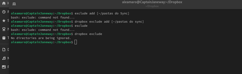 Please ignore the typo in the middle. Like I said I'm very new to linux ( 2months). "pastas do sync" is the folder I want to exclude from being sync by dropbox. I'm not sure the Cli is correctly written, because as you can see, nothing happens. Thank you for your help. I have also tried to paste the all path.