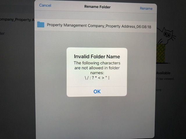 So, when I was using DropBox on my iPad I notice that by default it changes the forward slash symbol with a colon. No problem. I'm sure there is a reason for that. However, when I attempt to change the file name to Property Management Company_Property Address_06:08:18 (using the same colon symbol) I get a message saying: