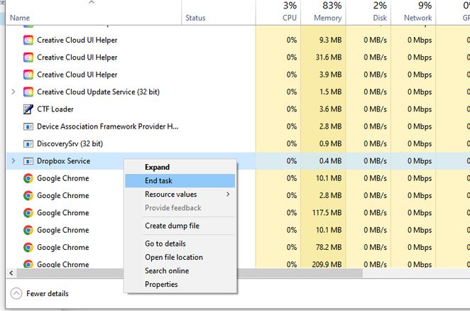 I've rebooted, quit Dropbox and ended the process, paused my backup program, paused OneDrive, signed out of Adobe and ended all Creative Cloud processes ...