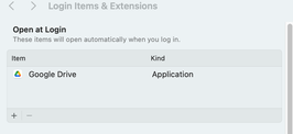 - I have taken a screen shot of the login items screen showing the Google Drive only....