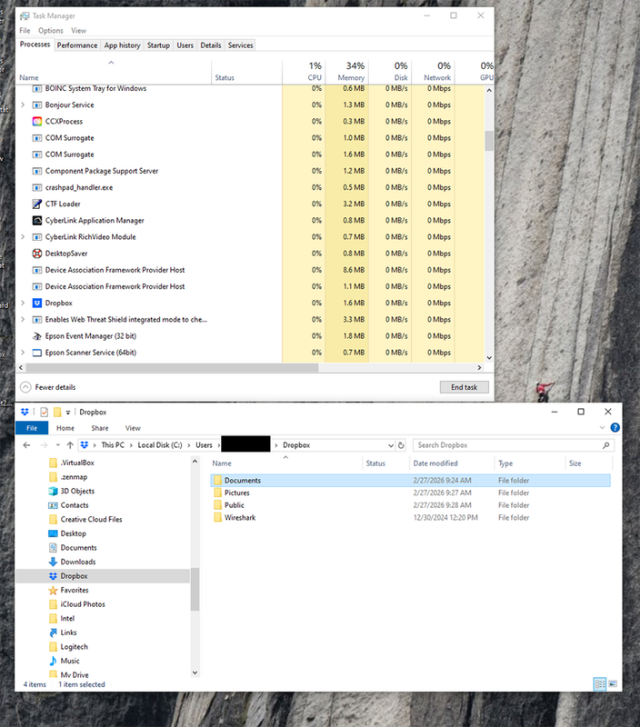 - I observe in Task Manager that when I Quit using the taskbar icon, the Dropbox processes exit.