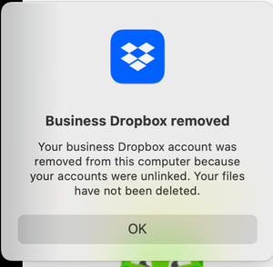Your business Dropbox account was removed from this computer because your accounts were unlinked. Your files have not been deleted.â