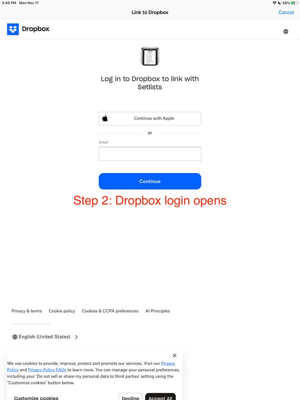 Dropbox sync problem with Setlist app. Can't connect with Dropbox.