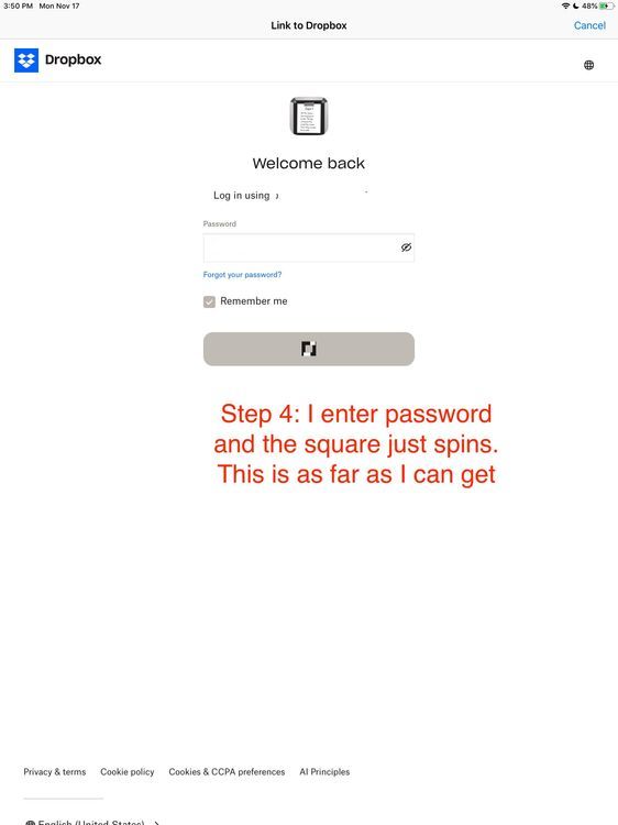 I am using an app called SetList on my IPad Pro. Its used for uploading songs charts. It uses Dropbox to upload from. Recently when I try to connect to Dropbox to upload a file, the Dropbox login page opens. I can enter my username. Its says welcome back and after I enter my password. it just spins the status square. I am running 13.1.3 on the Ipad. The Setlist app has not been updated in years. Any suggestions would be greatly appreciated.