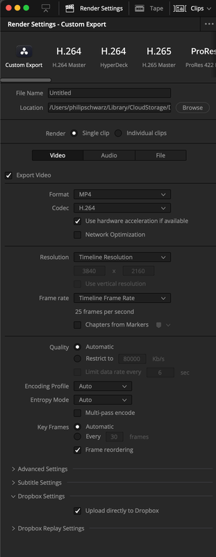 However, if I want to link a file and the comments with a timeline in Resolve, I have to export it via the checkbox for "Upload to Dropbox", which uploads it to the root dropbox folder and not to the project. As I set the normal file destination for a location within dropbox as well, I get two times the same file in different locations, with the wrong file being linked to my timeline in Resolve.