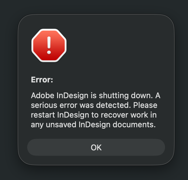 I have a shared Dropbox with my colleges, and I work from home. Earlier this week I was working in InDesign, and it crashed while I was working. A message said it was a serious error, but no info what the error was about. (I have attached several screenshots below) Anyway, I started InDesign again, but the document I was working on could not be opened, because it was damaged. I work as a freelance book designer, but luckily for me I was only working on a book cover, and not the inside of the book. It was annoying, but not the end of the world.