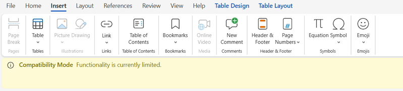 Thanks for the visual, jhmosow! Since it looks like you’re using Word for the web in compatibility mode, you can take a look at this article for more info.