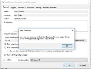I'm trying to set up a Scheduled Task that will run 'Dropbox.exe' at a specified time. Ive set it up easily on my Windows 7 machine, but on my Windows 10 PC, I keep getting the error - "One or mor...