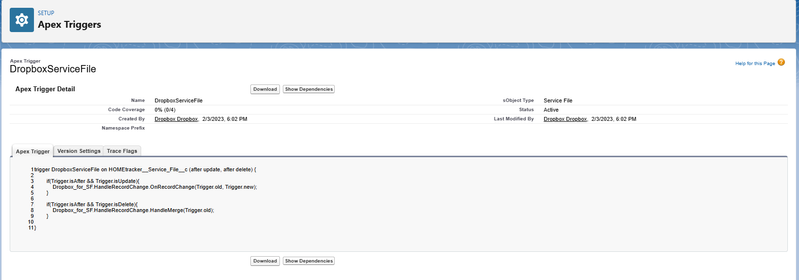 After further investigation, I believe the issue is caused by the Apex trigger DropboxServiceFile, which references the Dropbox package. I contacted HomeKeeper, which manages the Service File functionality in our org, and was advised to either contact Dropbox directly or reach out to Salesforce.
