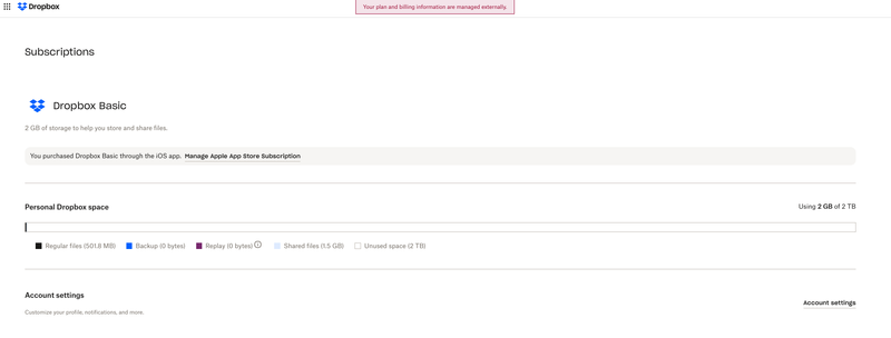 I have tried to upgrade directly through Dropbox but I get redirected to my account overview page and there is a message that says 'You purchased Dropbox Basic through the iOS app. Manage Apple App Store subscription (as a hyperlink)'