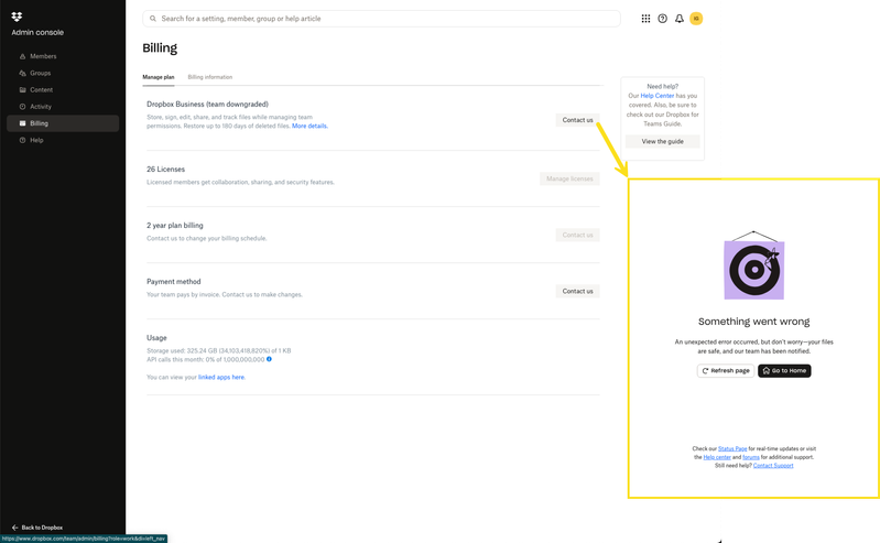 I forgot to mention : To complete the picture: the "Contact Support" button on the Billing page redirects to an error page — making it even harder to get in touch with Dropbox.