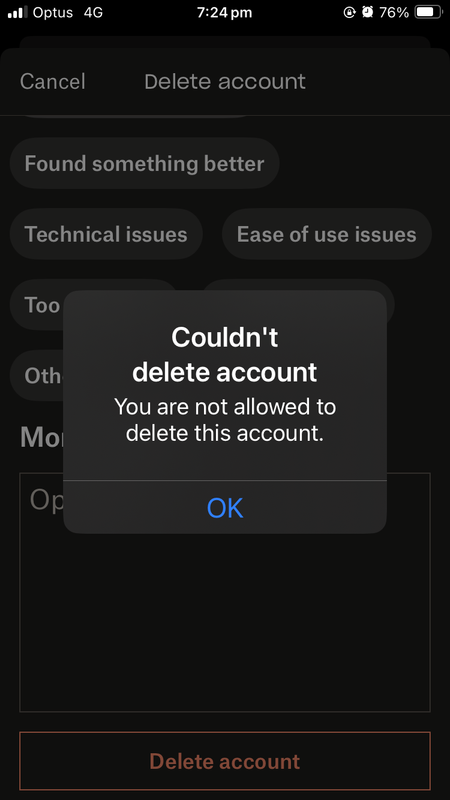 When I go to delete account it says I’m not allowed to. Been trying to cancel subscription. Please help