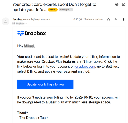 Today, I received an email from Dropbox with the subject "Your credit card expires soon! Don’t forget to update your info" with the following text: Your credit card is about to expire! Update your b...