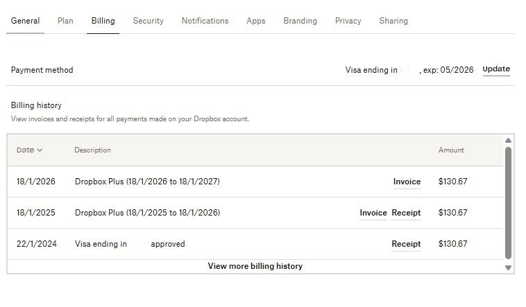 If the plan was purchased through a mobile app store, billing and card details must be managed directly through that app store, not from Dropbox.