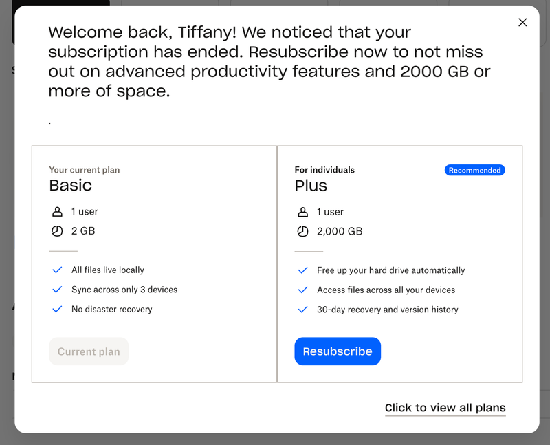 'Welcome back, ............! We noticed that your subscription has ended. Resubscribe now to not miss out on advanced productivity features and 2000 GB or more of space.'