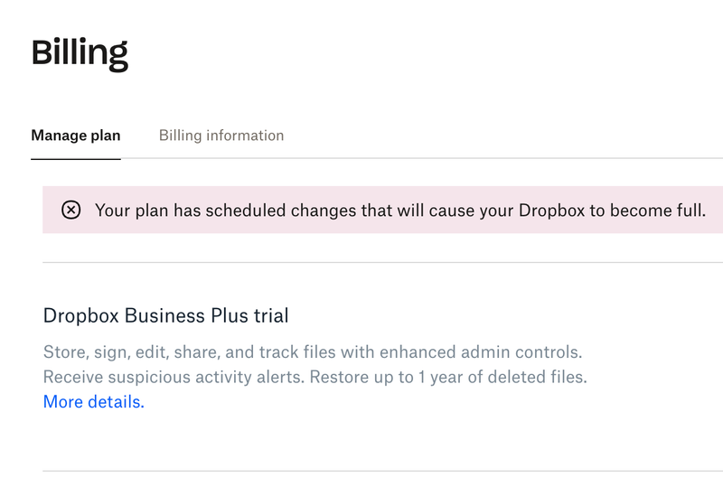 Hello i have DROPBOX PROFFESIONAL and today i signed by mistake to Trial of dropbox business which this downgrade my account to 2 tb and i have 4 TB how i can downgradrade since i get error 500 when i try to down grade ? I am attaching all the printscreens of the process to see also !