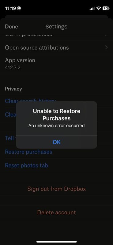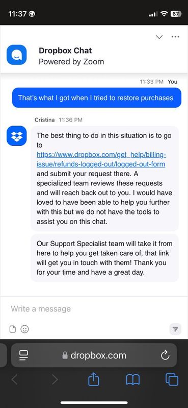 Initially, I had a Dropbox monthly payment plan, but I canceled it in January and switched to the annual Dropbox Plus plan. I have a receipt confirming the successful payment. However, I recently noticed that the app is unable to charge my card and is prompting me to update my billing address. I reached out to Apple Support, and they confirmed that my monthly plan was canceled and that I purchased the annual plan. Despite this, my attempts to speak with a live representative at Dropbox have been unsuccessful. Moreover, my account now appears to be on the Dropbox Basic plan instead of the annual plan I paid for. Last night, I finally managed to chat with a representative who advised me to refresh my purchases, but I encountered an error when doing so. The agent informed me that she did not have the tools necessary to resolve the issue. Given that my account has been downgraded and customer service options for Dropbox Basic are limited, how can I get the appropriate assistance to rectify this problem?
