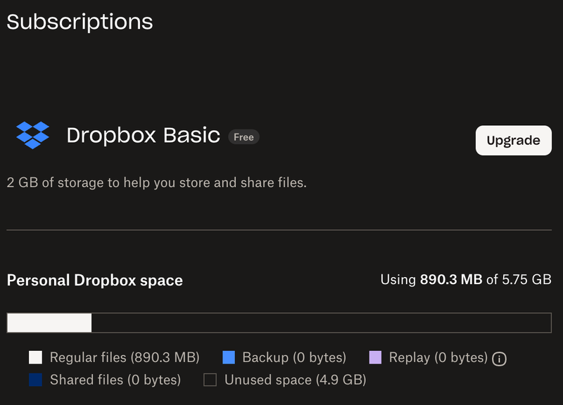 Very helpful, Hannah—it shows Basic and that I have 2 GB of storage for storing and sharing. It also shows my personal Dropbox space is using 893 MB of 5.75 GB. So I'm a wee bit confused about the two messages of 2 GB vs 5.75 GB.