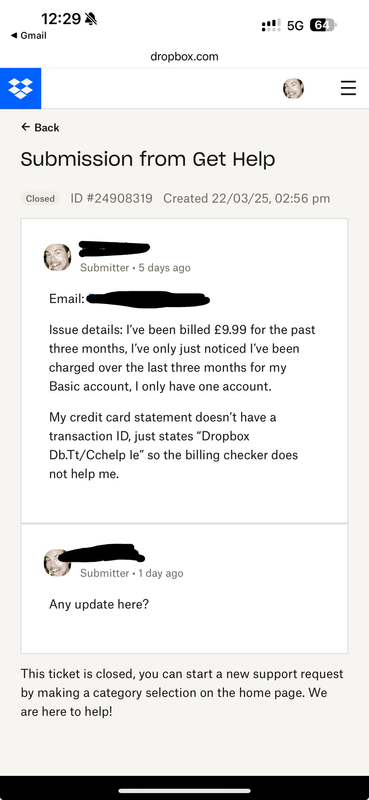 I’ve only just noticed I’ve been charged over the last three months for my Basic account, I’ve tried to log a ticket, but that’s not allowed with a basic account so I can't get help or talk to a human!!