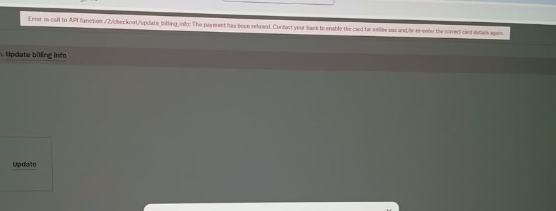 Error in call to API function /2/checkout/update_billing_info: The payment has been refused. Contact your bank to enable the card for online use and/or re-enter the correct card details again.