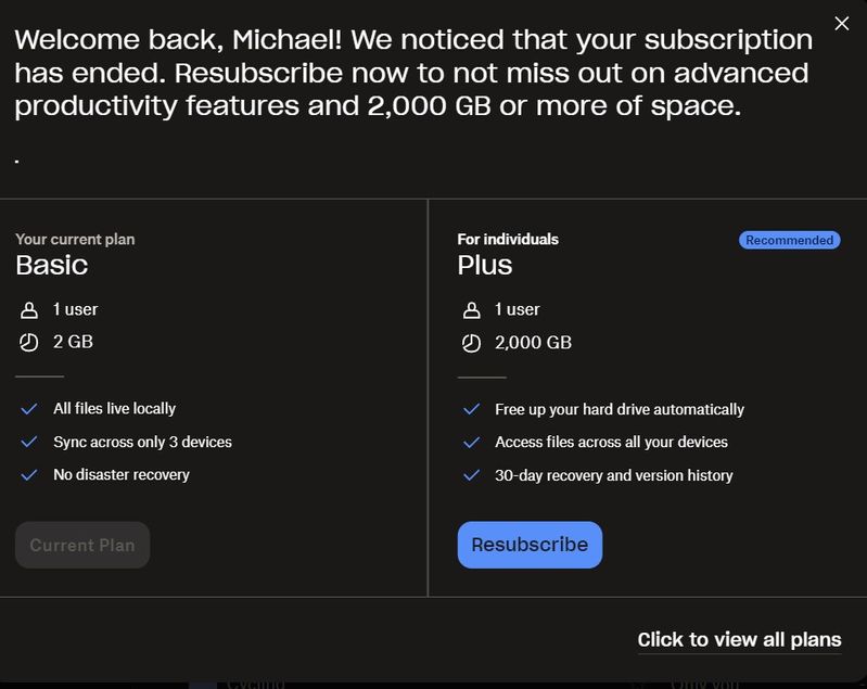 The popup states "Welcome back, Michael! We noticed that your subscription has ended. Resubscribe now to not miss out on advanced productivity features and 2,000 GB or more of space."