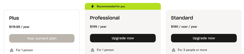 When either of us visits the Upgrade page, all we see are Plus (our current plans), Professional, and Standard.