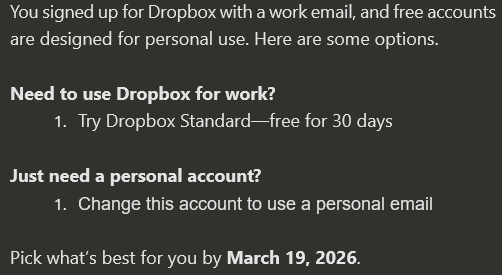 If you're using a Dropbox Basic account with a work email, you’ll have 30 days to choose which option best for you: