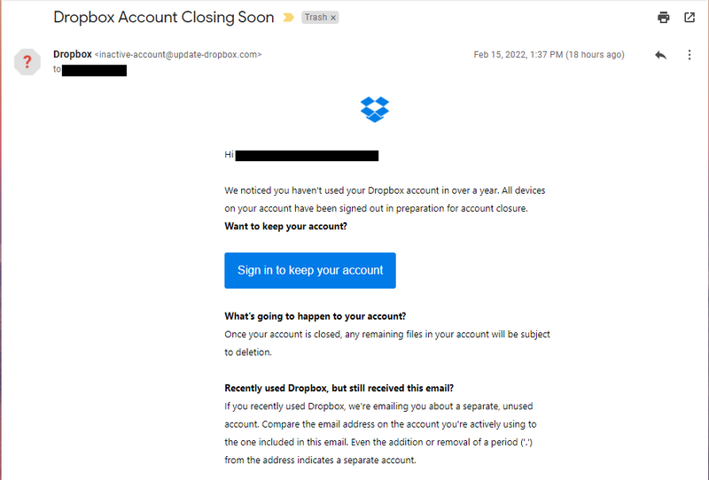 I have the free dropbox account. I received an email saying that my account will be closed on Thursday because I haven't used my account in over a year. This is crazy. I am in my account everyday, working with files. I stay signed into my account and do not sign out. I am signed in on 3 different devices. The email says I have been signed out on all devices in preparation for account closure. As far as I can tell, I am still signed in on all devices. The email says it could be contacting me regarding an unused account, but the email is correct for the account that I am using. Do I need to sign out of my account and back in for it to register that my account is active? Wouldn't adding , removing, and editing files show activity?