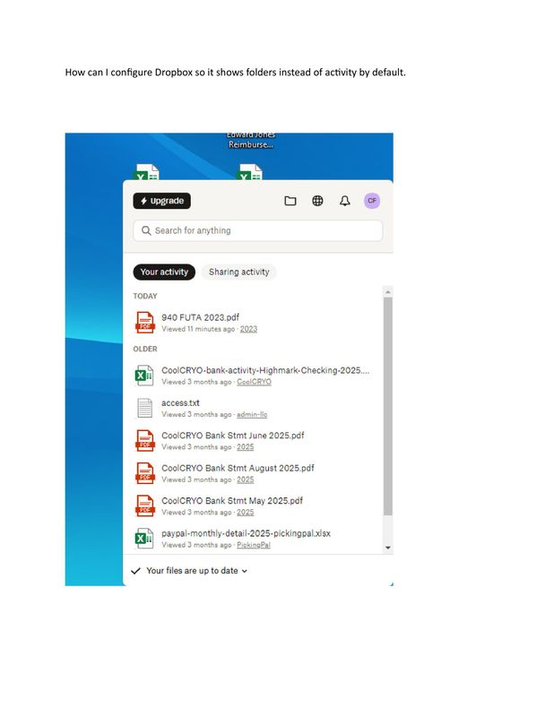 How can I configure Dropbox so it shows folders instead of activity by default, here is how it currently opens, but it use to pop up with folders instead of activity by default.