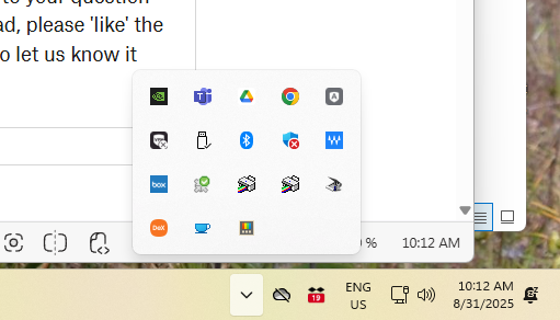 So, this is what I see. There is no DropBox icon, even when I open via that little expansion arrow. If I click on my Dropbox Icon on my desktop, or open it via what passes for the start menu these days, I just open a Windows Explorer Window that has no Icons or Initials. I have the same issue Muley has.