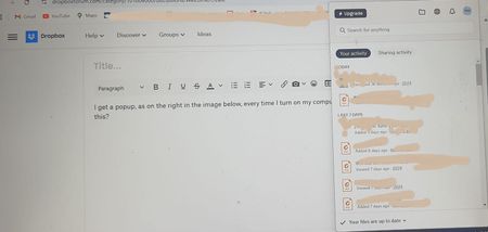 I get a popup, as on the right in the image below, every time I turn on my computer. How do I stop this?