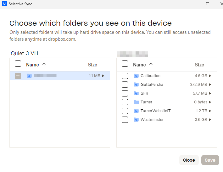 1. I have two accounts, institutional and personal. Within the institutional (I made a slight mistake in my previous message): the directory listed on my PC is empty (shown as C: above). The directory and sub-directories on C: is empty and on G: is populated but contains only obsolete files (from 2017 and 2022). The directory on H: I have set up a Dropbox directory TurnerWebsiteIT into which I copied my PC folders containing the files on H: - the listings in this directory on the PC show all the sizes as 0. This is not synced with the cloud (when it was, the files swamped my C: drive)