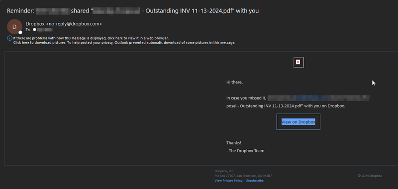The sending email is no-reply@dropbox.com but the body of the email has employee's name/company email in it. Example of the email one of his client's received.Elements of the email have been obfuscated for the privacy of the end user/client. I am happy to provide more detailed information to the support team.