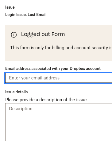You need to enter an email address that you have access to, so you can receive a response. Use the Details section to list the email address of the Dropbox account that you're unable to access.