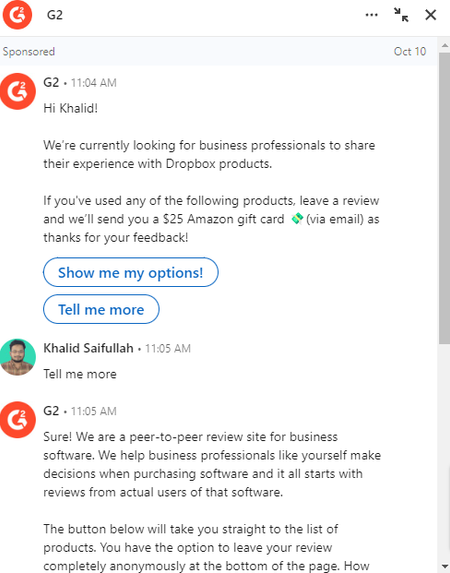 Recently, i got a message on LinkedIn. The message is sponsored and it's from a company named G2. Is it legit or a scam?