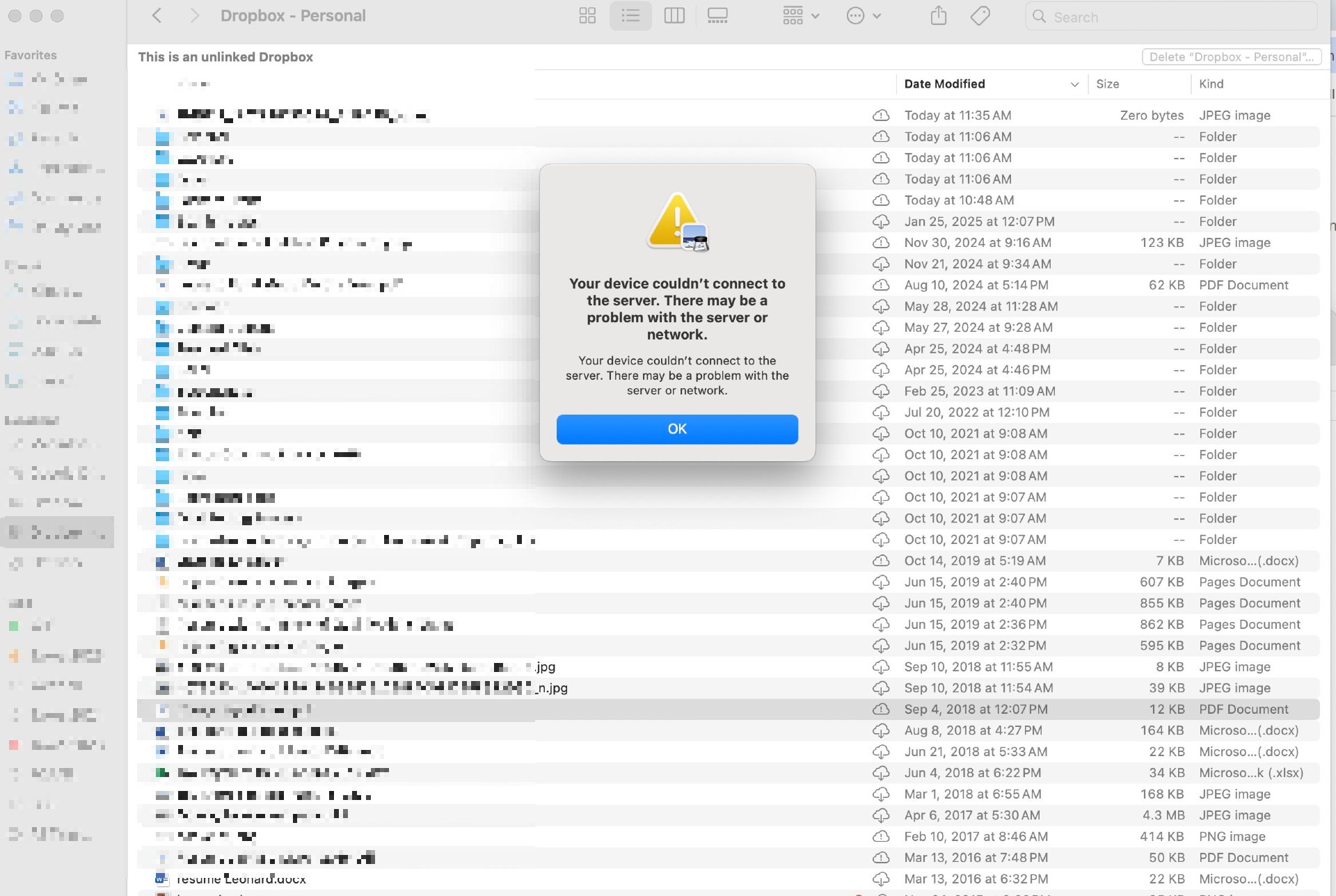 I can see them in the side bar of my apple finder under DROPBOX-PERSONAL, but they are not syncing and when I click a file I get an error message: Your device couldn’t connect to the server. There may be a problem with the server or network.