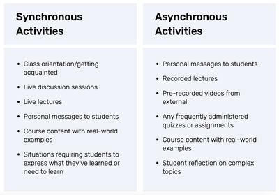 While some activities can be effective synchronously or asynchronously, others are best suited for one specific method. In their research, Digital Promise and Tyton Partners found that instructors were using synchronous and asynchronous learning for the activities in the image above.