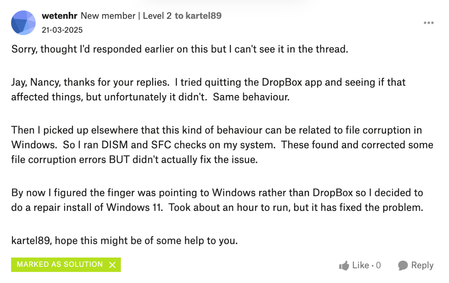 The Dropbox Community team is active from Monday to Friday. We try to respond to you as soon as we can, usually within 2 hours.