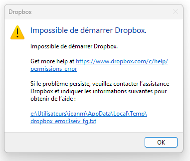 Ni la partie I (la commande "icacls "%HOMEPATH%" /grant "%USERNAME%":(F)" ne fait rien; je dois arrêter Cmd et relancer pour pouvoir donner les autres commandes) , ni la partie II ne donnent de résultat. Après avoir indiqué "Démarrage", une fenêtre indique rapidement "Dropbox doit redémarrer pour achever la déconnexion" puis disparaît et l'écran de connexion s'affiche à nouveau (L'appareil est bien ajouté à la liste des appareils connectés).