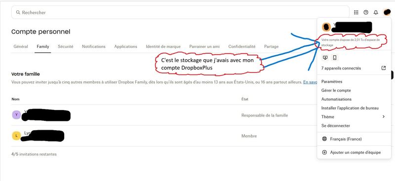 J'ai ajouté le forfait familial à mon compte DropboxPlus afin de permettre a ma conjointe de bénéficier de plus d'espace de stockage que son forfait Basic (gratuit) et du même coup partager plusieurs dossiers et fichiers qui dépassaient sa capacité de stockage de son forfait gratuit.