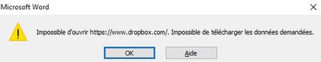Bonjour, Depuis peu, mes applications Office de Microsoft donnent le message d'erreur suivant lorsque je clique sur un lien qui pointe sur dropbox.com : "Impossible d'ouvrir https://www.dropbox.com...