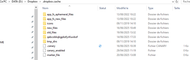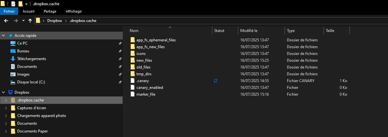 En ce qui concerne le fichier .canary dans le cache de Drop-box, pourriez vous confirmer que ce fichier est de nouveau en état de synchronisation ou pas?