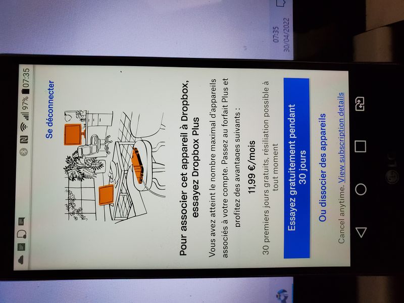 Merci beaucoup pour votre réponse. Vous avez le don d'expliquer les choses façon très claire mais hélas mon problème n'a pas été résolu. Je déconnecte mon appareil et le reconnecte à Dropbox mais j'ai toujours la publicité et, hélas, pas de croix en haut à droite de l'écran me permettant de fermer la publicité pour Dropbox Plus.