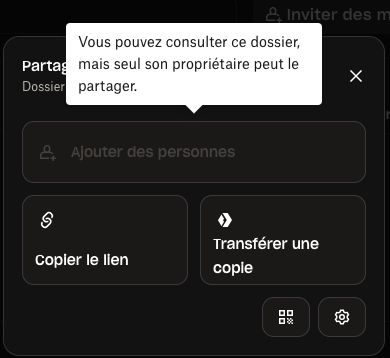 je voudrais partager un dossier dont je suis propriétaire, j'ai vérifié que j'en étais bien la propriétaire (cf. copie d'écran 1) mais quand j'ouvre la fenêtre de partage, je ne peux pas entrer d'adresse mail car c'est indiqué que je ne suis pas la propriétaire (cf. copie d'écran 2).