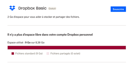 Bonjour, Dropbox m'indique que j'ai dépassé mon quota, soit 9 Go sur 8,38. J'ai supprimé bcp de fichiers pour passer en dessous, mais ça ne change rien. Pourtant, sur le site, je n'atteint même pl...