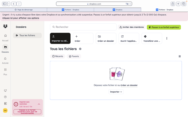 Utilisateur de Dropbox depuis de nombreuses années, je suis confronté à une situation inédite et pour l'instant sans solution apres deux heures d'essais.