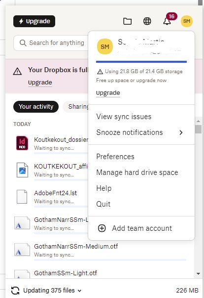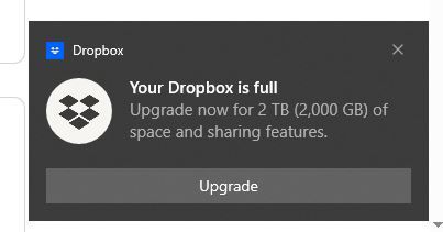 Vous avez utilisé 102 % de votre espace de stockage."En cliquant sur l'icône Dropbox dans la barre d'état système, le message d'erreur dit : "Your dropbox is full. Upgrade to get more space".